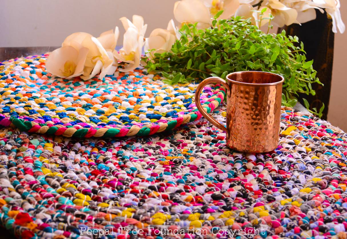 Style and description: Colorful rug/ mat, comfortable to sit on made from fabric waste from garment factories. Logo cannot be printed.